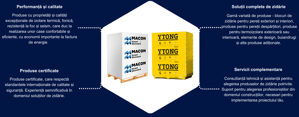 Gamă variată de produse – blocuri de zidărie pentru pereți exteriori și interiori, produse pentru pereții despărțitori, produse pentru termoizolare exterioară sau interioară, elemente de design, buiandrugi și alte produse adiționale.
